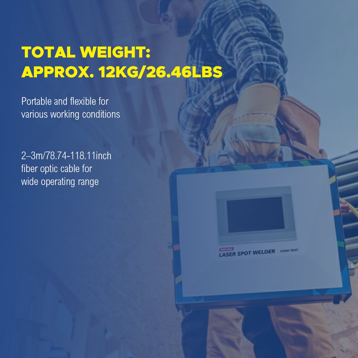 INTRODUCTION - ZAC 300W Portable Laser Welder is a professional-grade solution designed for ultra-thin sheet welding, precision metal fabrication, and DIY craft production. Model: DGW-300, Peak Power: 600W, Laser Wavelength: 1080 ±5nm, Pulse Frequency: 1 - 300Hz, Modulation Frequency: 1 - 5000Hz, Max Single Pulse Energy: 6J/10ms, Output Fiber Length: 2~3m, Core diameter: 100μm, Input power: ≤2000W