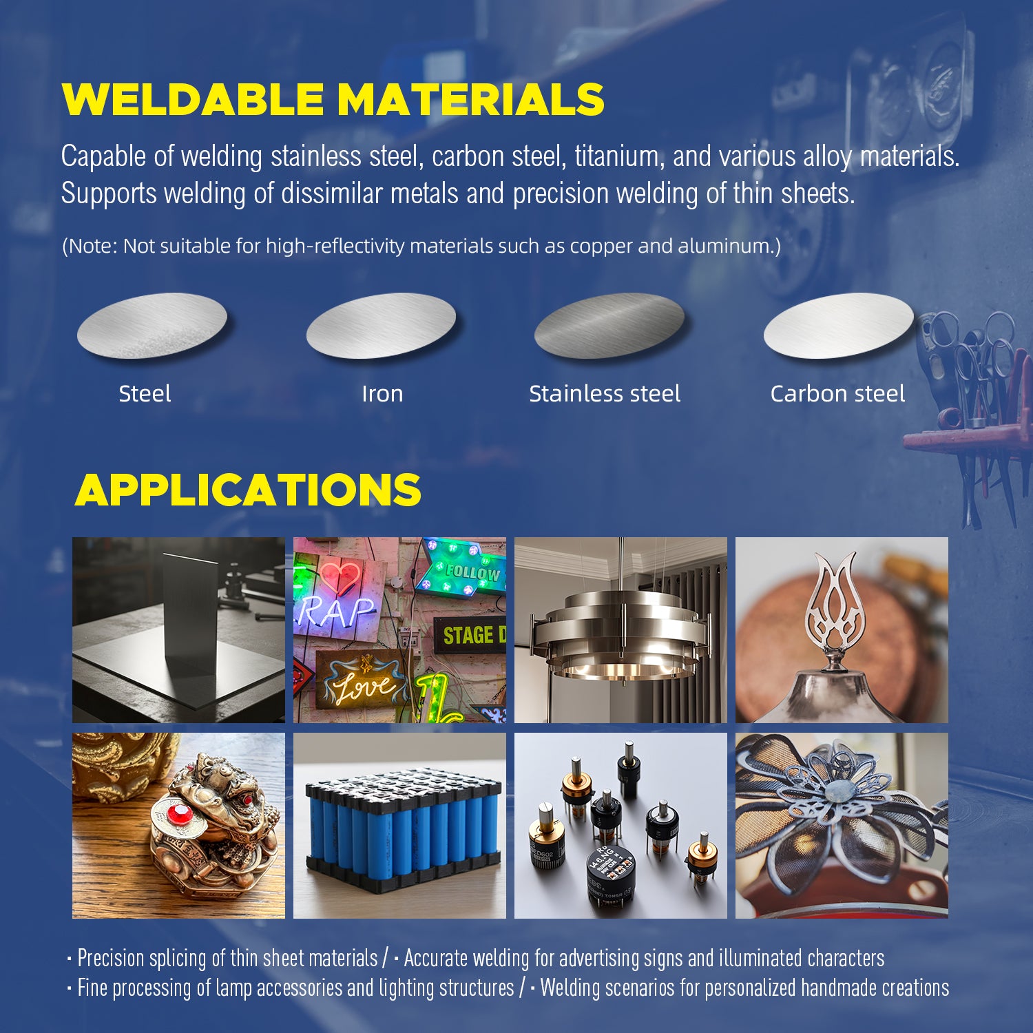 - APPLICATION - IDY metal welder lightweight 12kg body and 2–3m fiber optic cable offer great flexibility for various working environments. Ideal for advertising signs, lighting fixtures, metal crafts, and DIY creations. Note: Suitable for stainless steel, carbon steel, titanium, and alloys. Not recommended for highly reflective materials such as copper or aluminum.