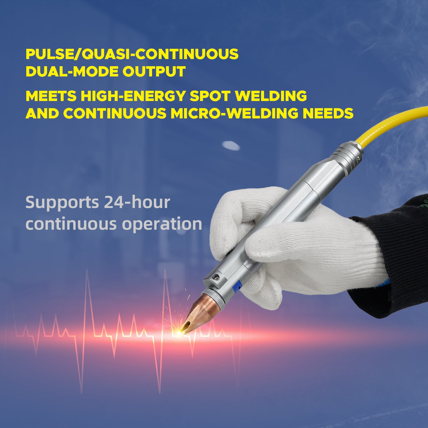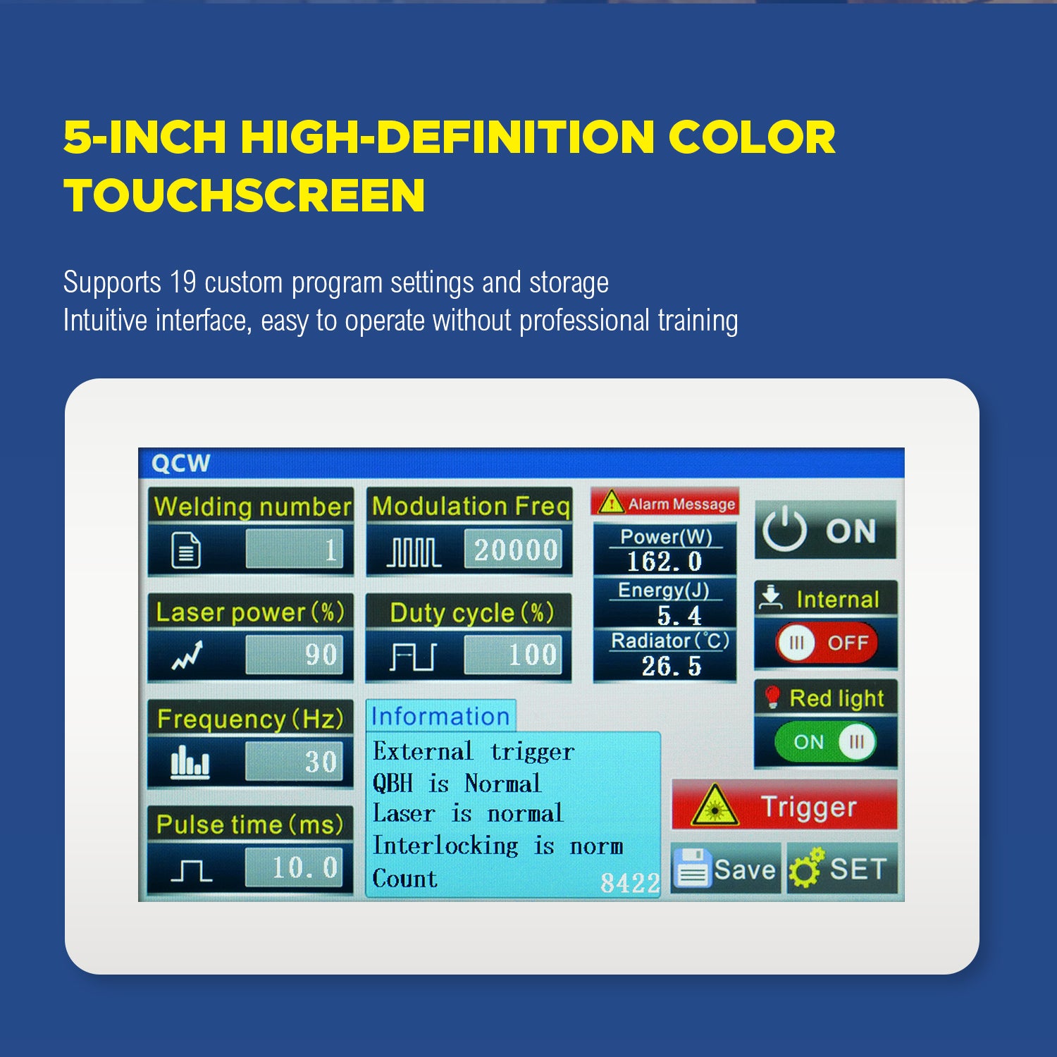 - PULSE & QUASI-CONTINUOUS DUAL MODE OUTPUT - Air cooled laser welder provides high-energy spot welding and continuous micro-welding for different materials and applications. Designed for 24-hour continuous operation with stable and reliable performance. 5" high-definition color display allows quick parameter adjustment and supports up to 19 custom programs. Air-cooled system provides high stability, low energy consumption, and easy maintenance