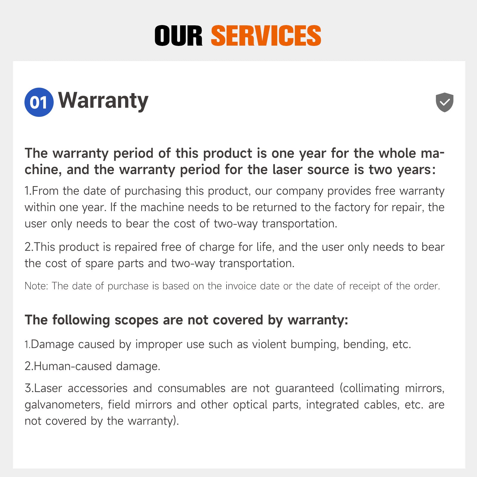 We provide 1 year warranty for the whole machine and 2 years warranty for the laser source. If you have any questions of the machine, please send us email via email, and our 24 hours customer service will support you.