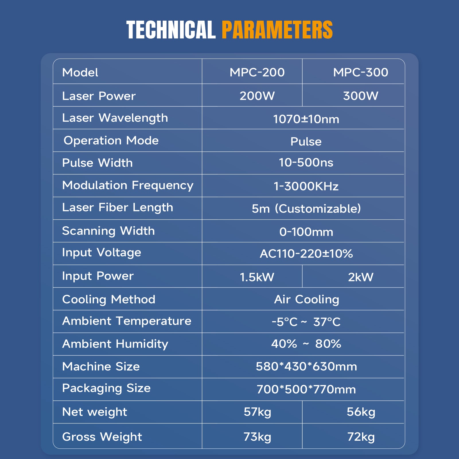 - INTRODUCTION - ZAC high efficiency laser cleaning machine is equipped with a high- quality laser source, specilizing in cleaning mould with precision. Model: MPC-200. Laser Power: 200W. Laser Wavelength: 1070±10nm. Operation Mode: Pulse. Scanning Width: 0-100mm. Input Voltage: AC110-220V±10%. Cooling Method: Air cooling. Machine Size: 22.83*16.93*24.8in. Net Weight: 144lbs/57kg.