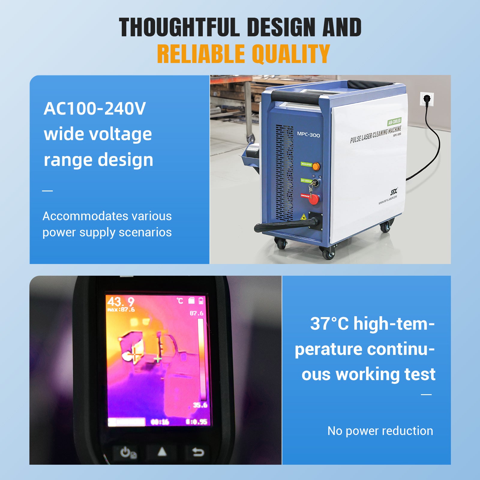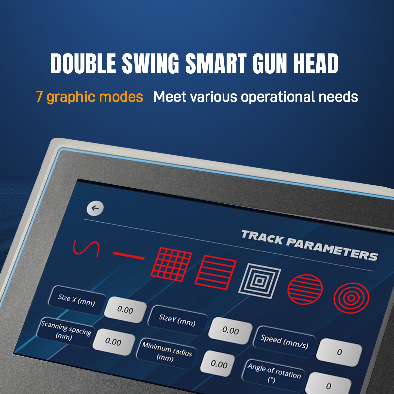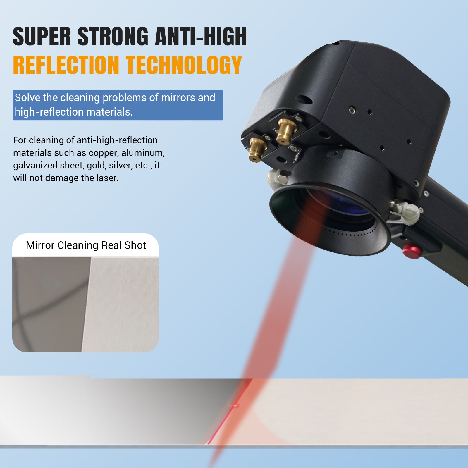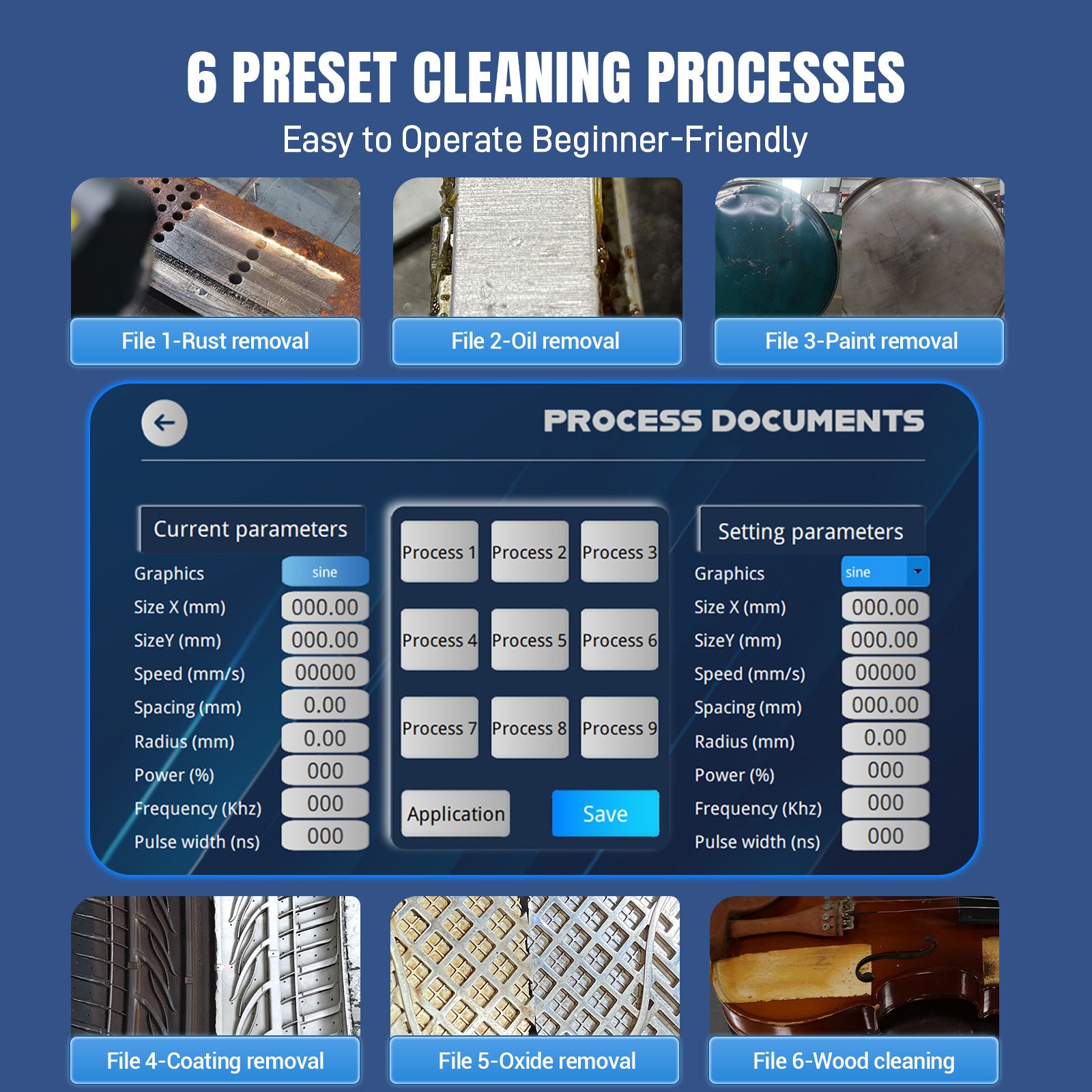 - HIGH EFFICIENCY - Featuring a double-wobble cleaning head, the system of this laser rust removal achieves up to 100mm scanning width, ensuring precise and efficient mold cleaning. The 9.8” touchscreen offers an intuitive interface for adjusting cleaning settings. Additionally, the system includes 7 built-in cleaning mode to meet different cleaning scenarios commonly found in mold maintenance.