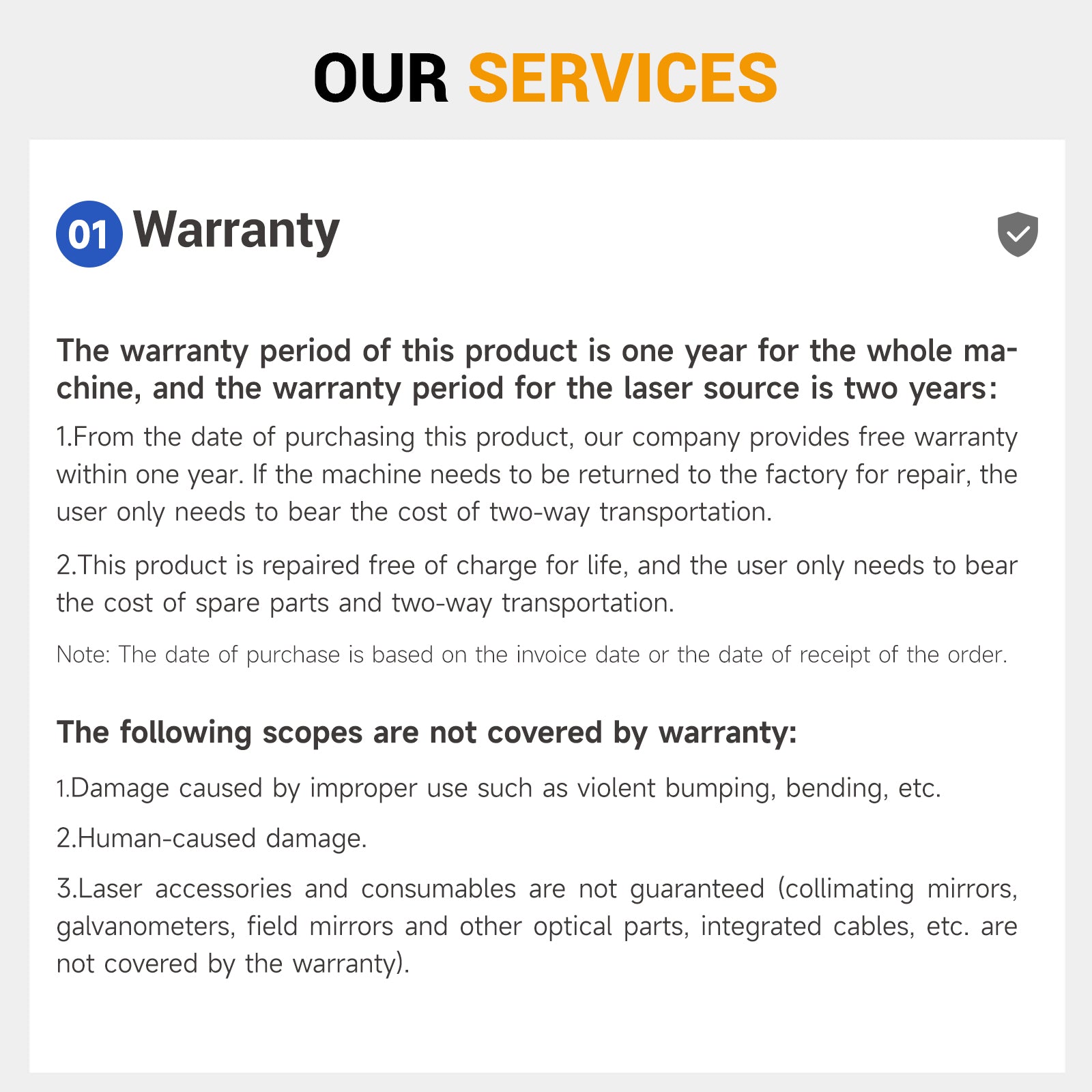 We provide 1 year warranty for the whole machine and 2 years warranty for the laser source. If you have any questions of the machine, please send us email via email, and our 24 hours customer service will support you.