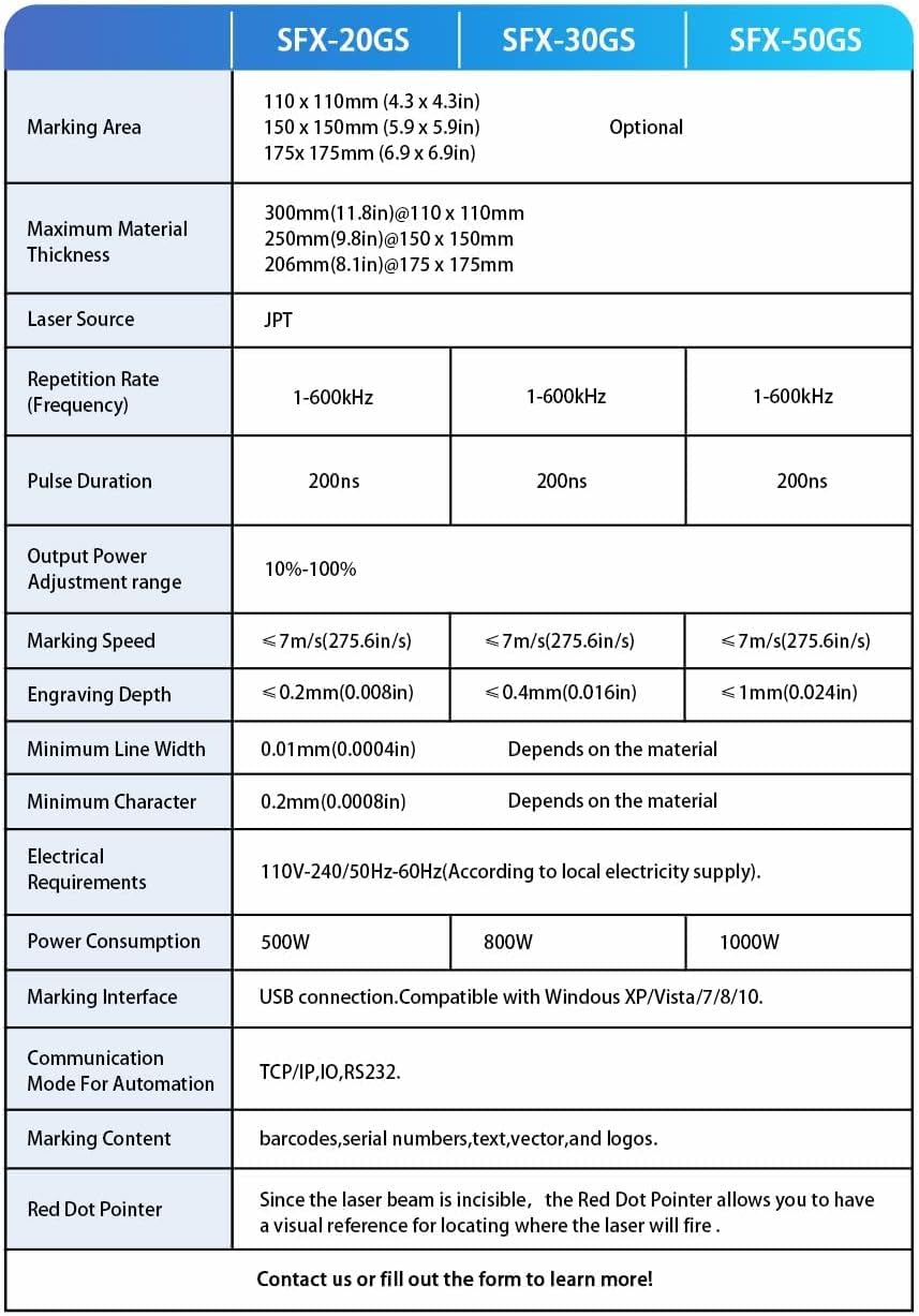 - INTRODUCTION: ZAC fiber laser engraver machine, can be used in many precision marking fields. Laser Power: 20W/30W/50W. Laser Type: JPT. Marking Area(Lens): 110*110mm(4.3*4.3in)/150*150mm(5.9*5.9in)/175*175mm(6.9*6.9in) Optional. Output Power Range: 10%-100%. Marking Speed: 7000mm/s. Engraving Depth:0.01-1mm. Input Voltage: 110V/220V, 50/60Hz. Cooling Method: Air cooling. Compatible with Lightburn and comes with EzCad2.