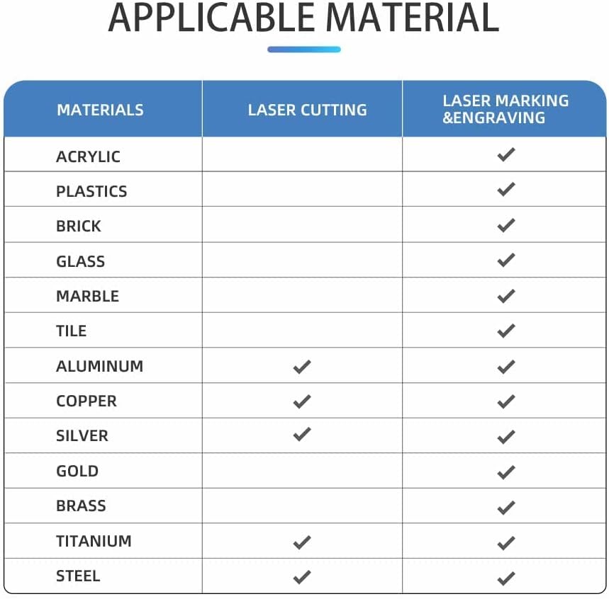 - WIDE APPLICATIONS: The life of fiber laser marking machine is about 100,000 hours which is suitable for many materials and industries, such as platinum, tungsten, titanium, carbide nickle, carbon steel,aluminum, stainless steel, Brass, Copper, Gold, Silver, metals, etc. Also some of non-mental such nylon, light button, ABS, PVC, PES, etc.