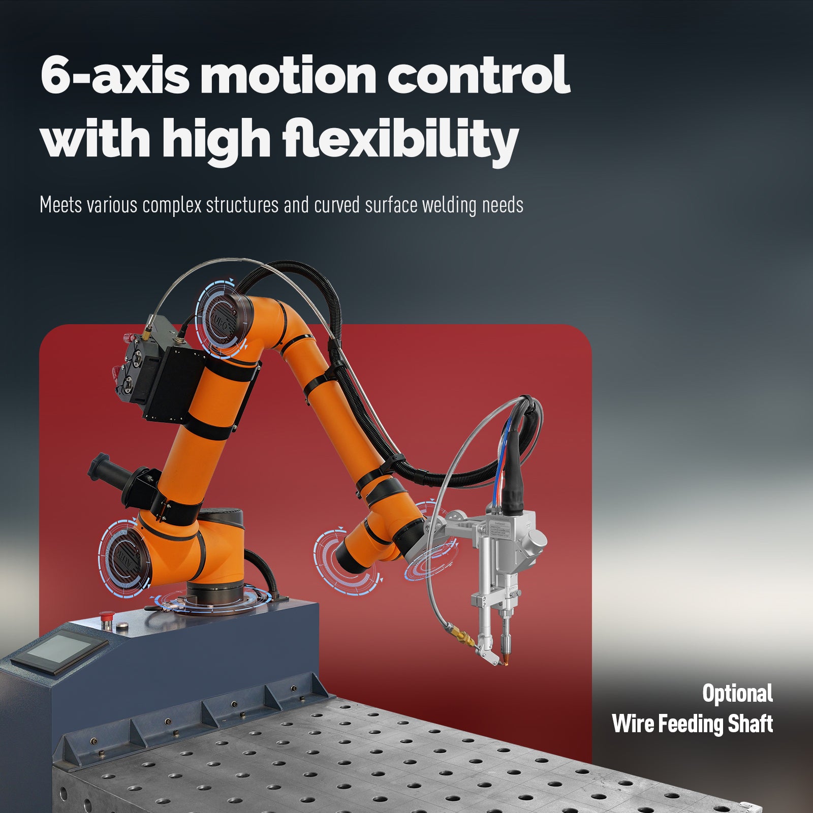 - HIGH FLEXIBILITY: Equipped with a high-precision 6-axis industrial robot arm, the system supports flexible motion control across complex welding paths. It ensures stable, repeatable movements with ±0.03mm precision, suitable for multi-angle, high-efficiency operations across diverse workpieces.