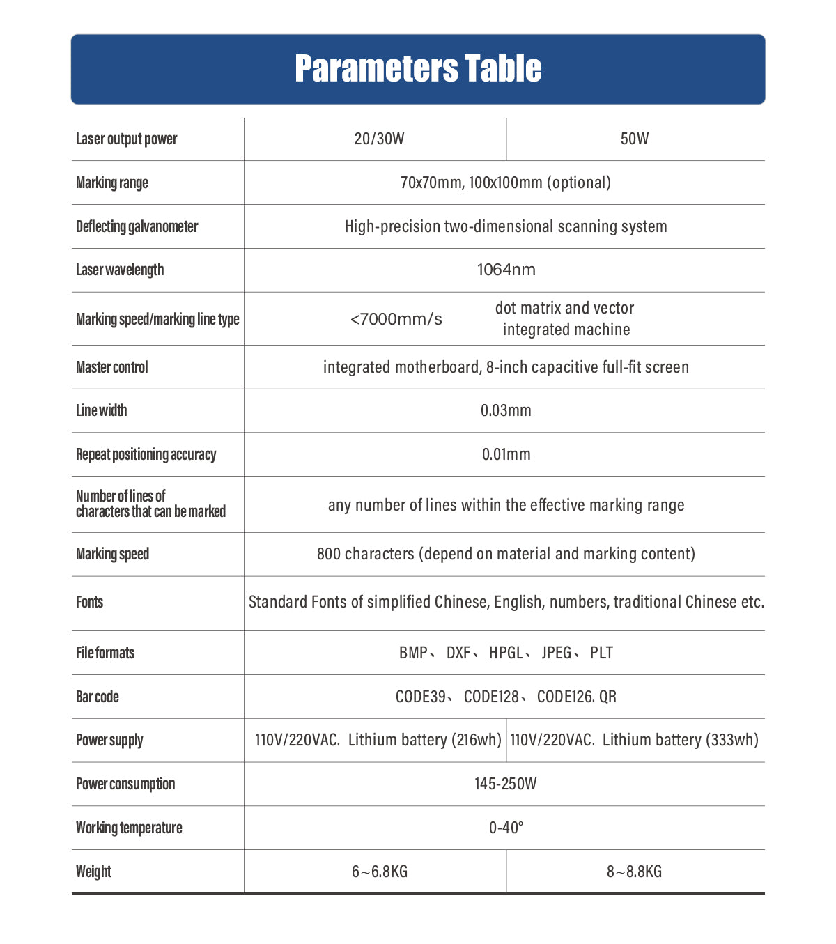 - Zone de marquage : 70 x 70 mm/100 x 100 mm