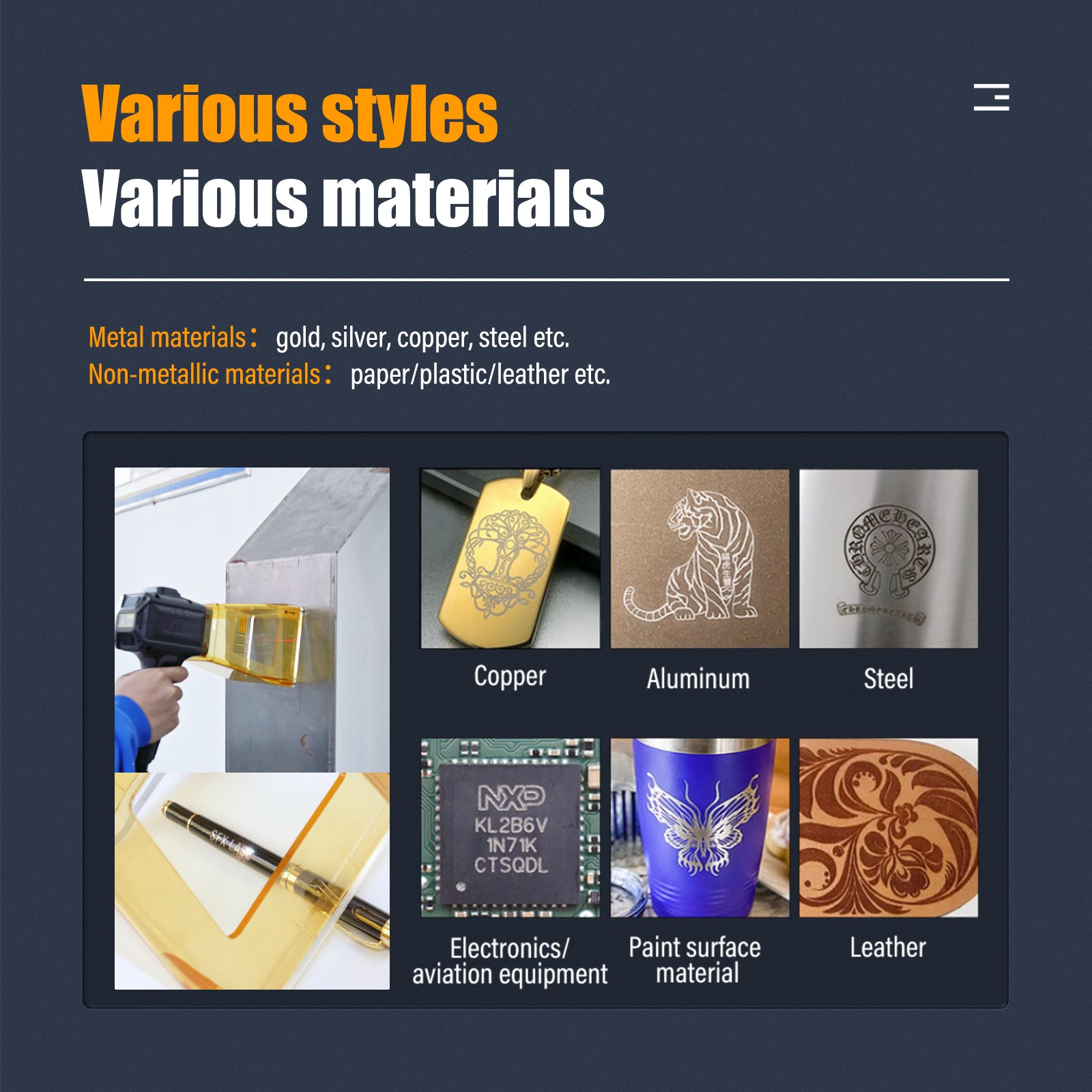 - APPLICATIONS LARGES - La machine de marquage laser portable grave de nombreux matériaux, y compris des matériaux métalliques et non métalliques, tels que l'or, l'argent, l'acier cuivré, le papier, le plastique, le cuir, etc. En dehors de cela, cette machine de gravure de fibre est également largement utilisée pour la personnalisation personnalisée telle que le codage de marque et le marquage de codes à barres.