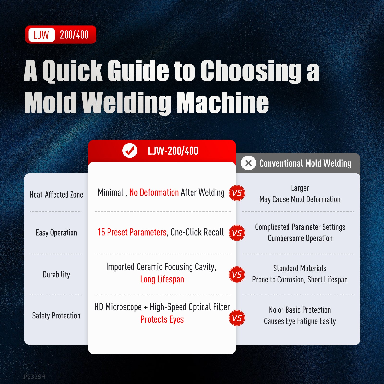 - INTRODUCTION - ZAC mold repair laser welding machine is ideal for repairing porosity, edge breakage, and overcut areas in precision injection molds, die-casting molds, and metal structural parts. Laser Wavelength: 1064nm. Focusing Cavity Reflector: Ceramic. Pulse Width: 1-20ms. Laser Frequency: 1-20Hz. Spot Adjustment Range: 0.3-2mm. Aiming & Positioning: Crosshair. Power Requirement: 380V±5%/50Hz(400W), 220V±5%/50Hz(200W). Welding Wire Diameter: 0.2-0.5mm(200W), 0.2-0.8mm(400W)