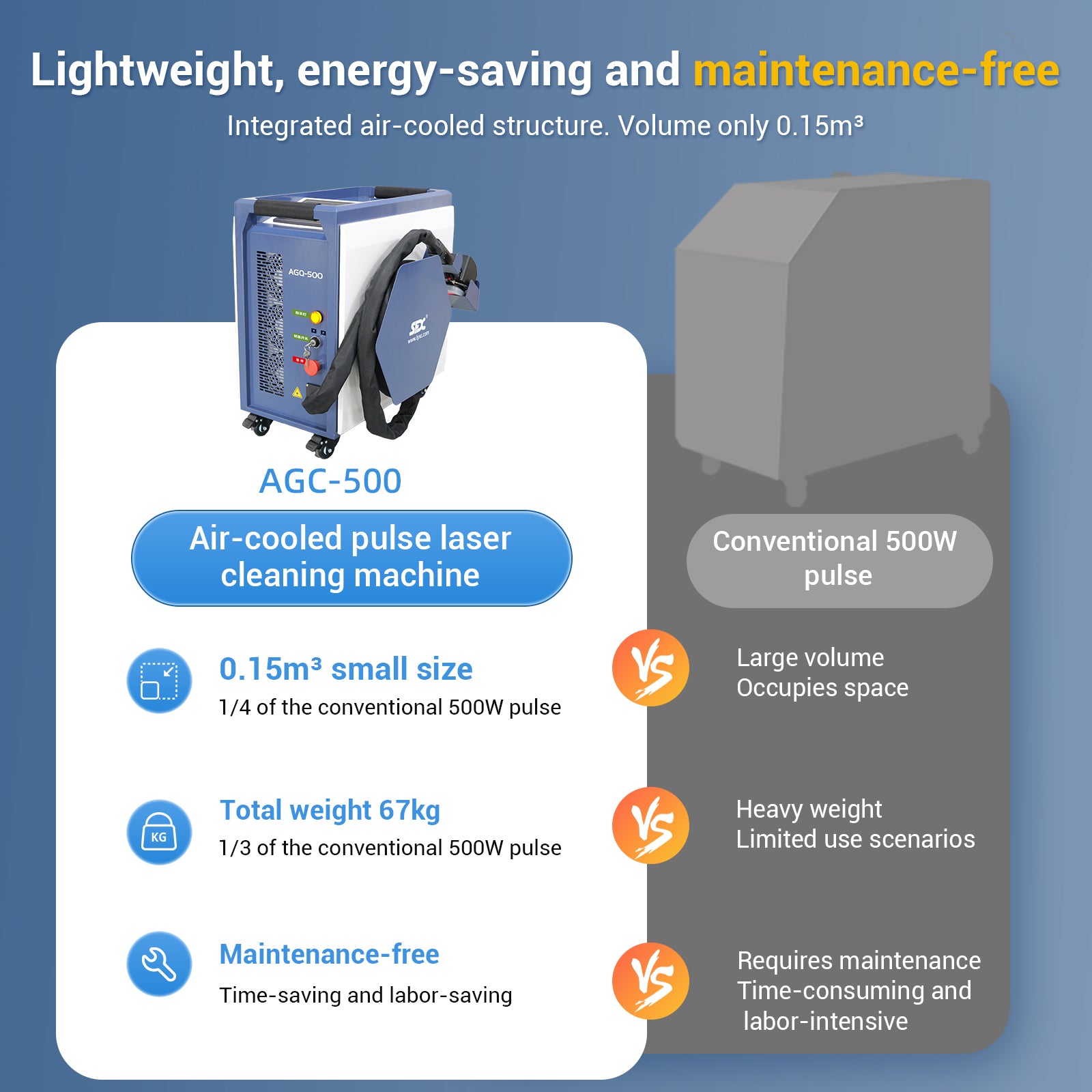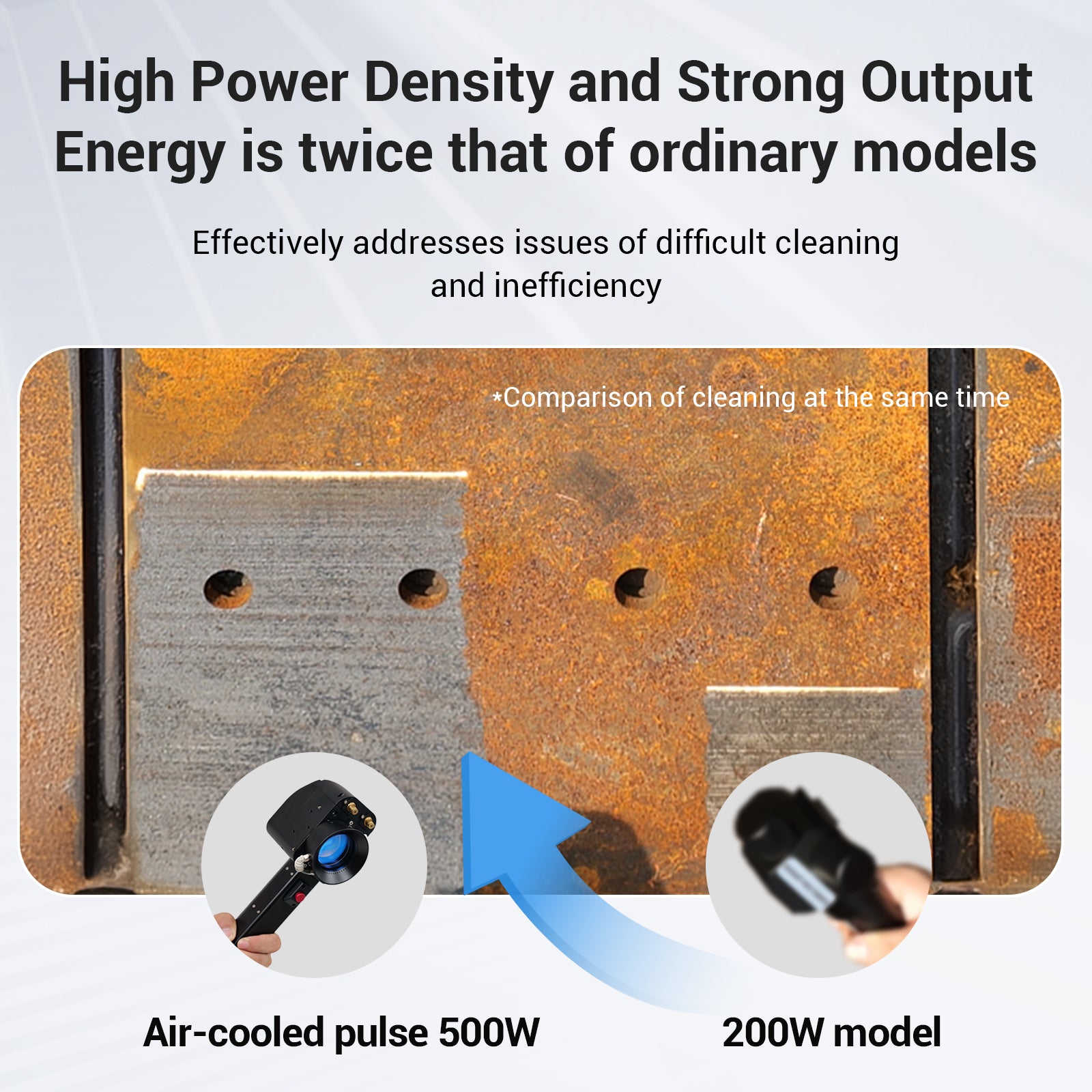 - LIGHTWEIGHT: Integrated air-cooled structure with a volume of only 0.15m³, which is 1/4 the size of a conventional pulse laser. Total weight is just 67kg, 1/3 the weight of a conventional pulse machine. The cleaning process is non-contact, ensuring no damage to the substrate, with no need for chemical reagents, consumables, or water cleaning. It produces no secondary pollution.