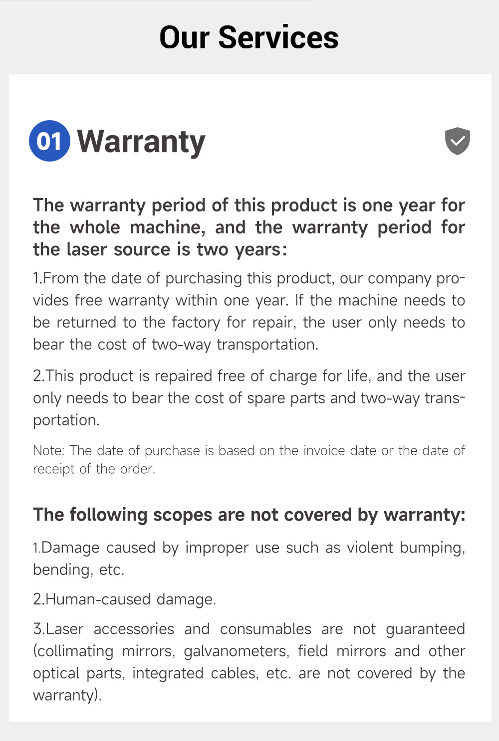 1 Year Warranty for the Whole Machine, 2 Years for Laser Source. No import duty and other tax for US Customers. English operation interface. Parameters are intuitive and adjustable. Lifetime technical assistance. Delivered to your door directly by FedEx/DHL/UPS. Of course, if you want to reduce transportation costs(by sea), pls feel free to PM us.