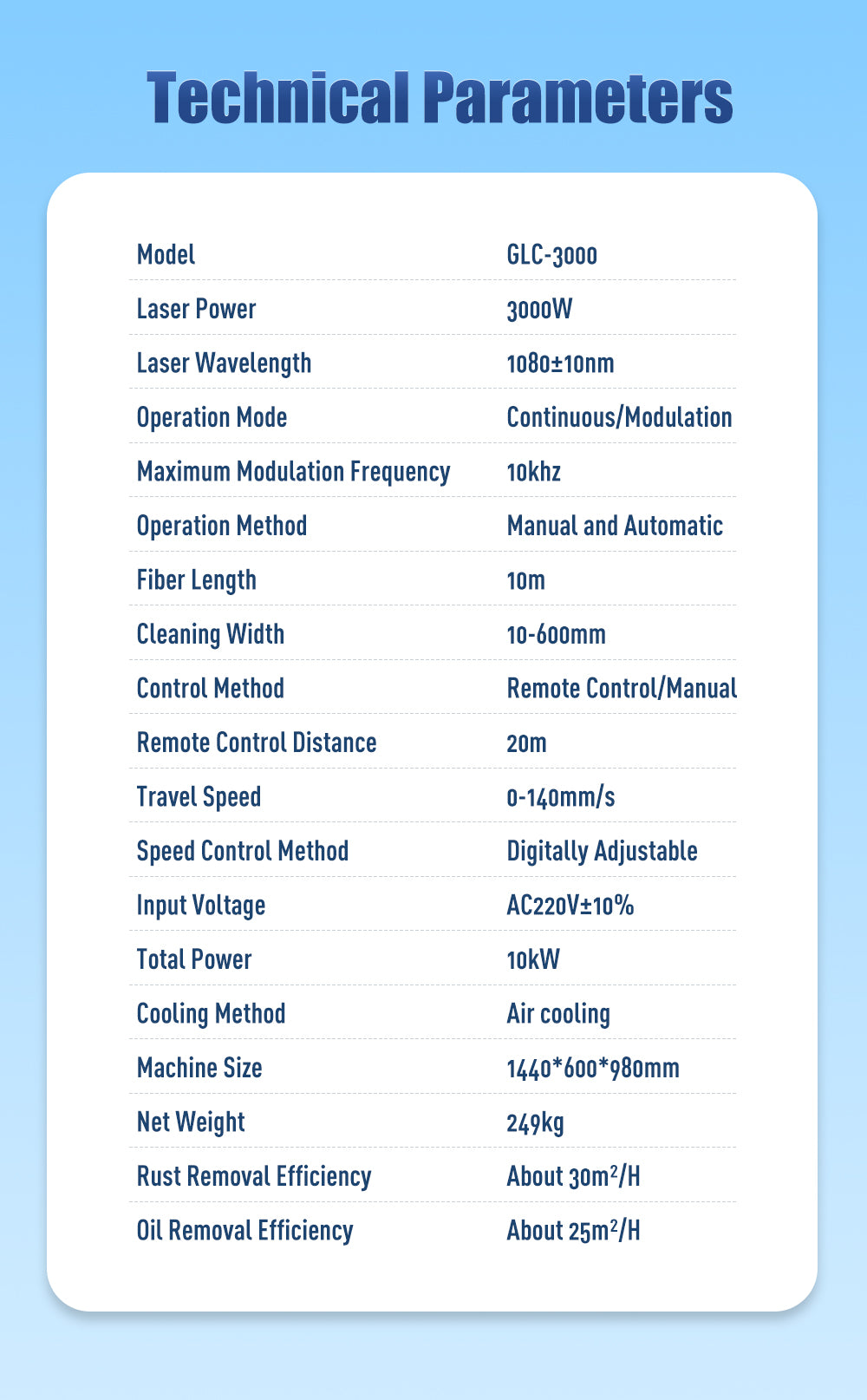- INTRODUCTION - ZAC 3000W laser rust removal for the floor is designed to resolve the issue of rust and oil, etc. on the floor which can save much time and labor. Laser Power: 3000W. Laser Source: MAX. Laser Wavelength: 1080±10nm. Operation Mode: Continuous/Modulation. Maximum Modulation Frequency: 10khz. Operation Method: Manual and Automatic. Cleaning Width: 10-600mm. Control Method: Remote Control/Manual. Input Voltage: AC220V±10%. Cooling Method: Air cooling. Machine Size: 56.7*23.6*38.6in. Net Weight: 249kg/549lbs. Rust Removal Efficiency: About 30㎡/h. Oil Removal Efficiency: About 25㎡/h.