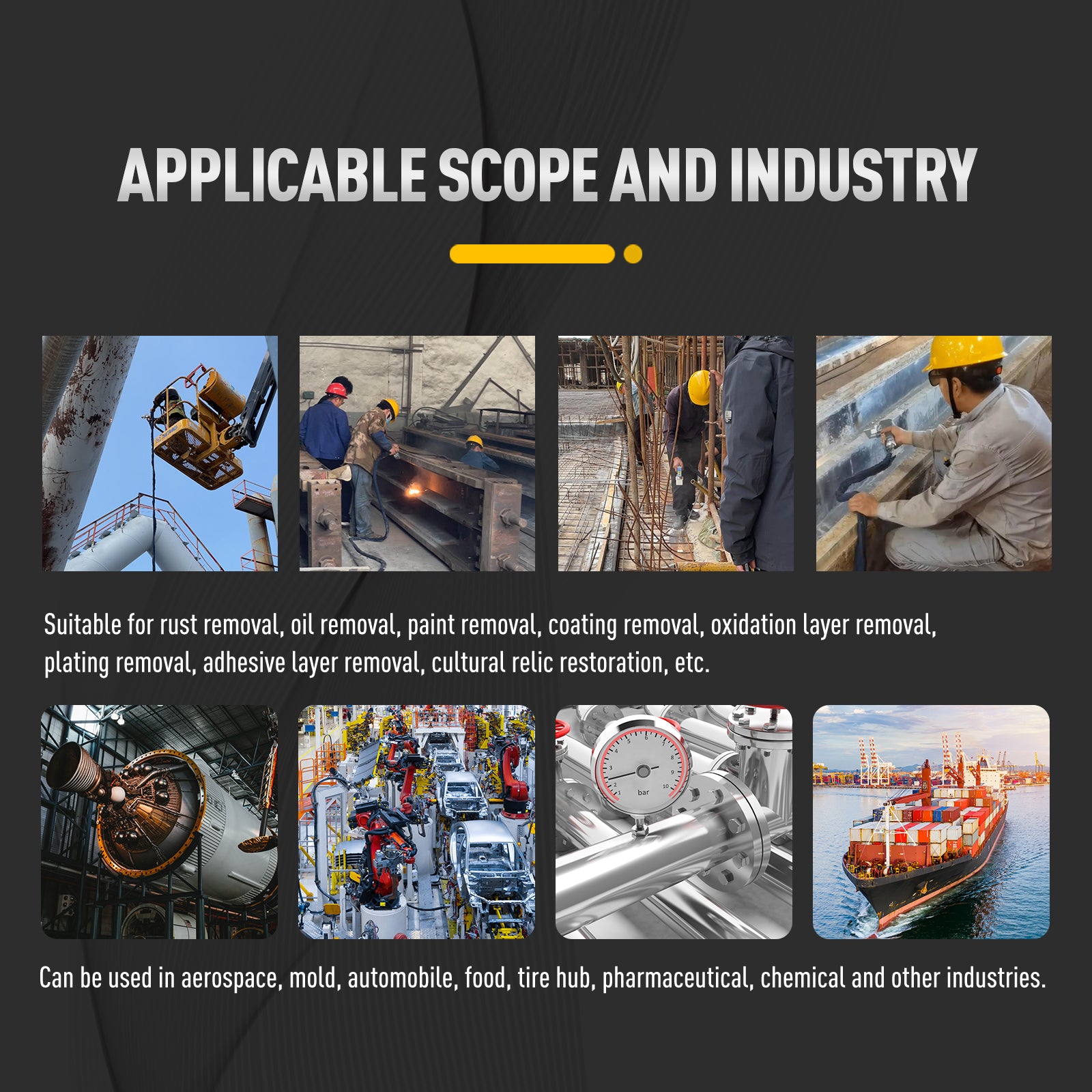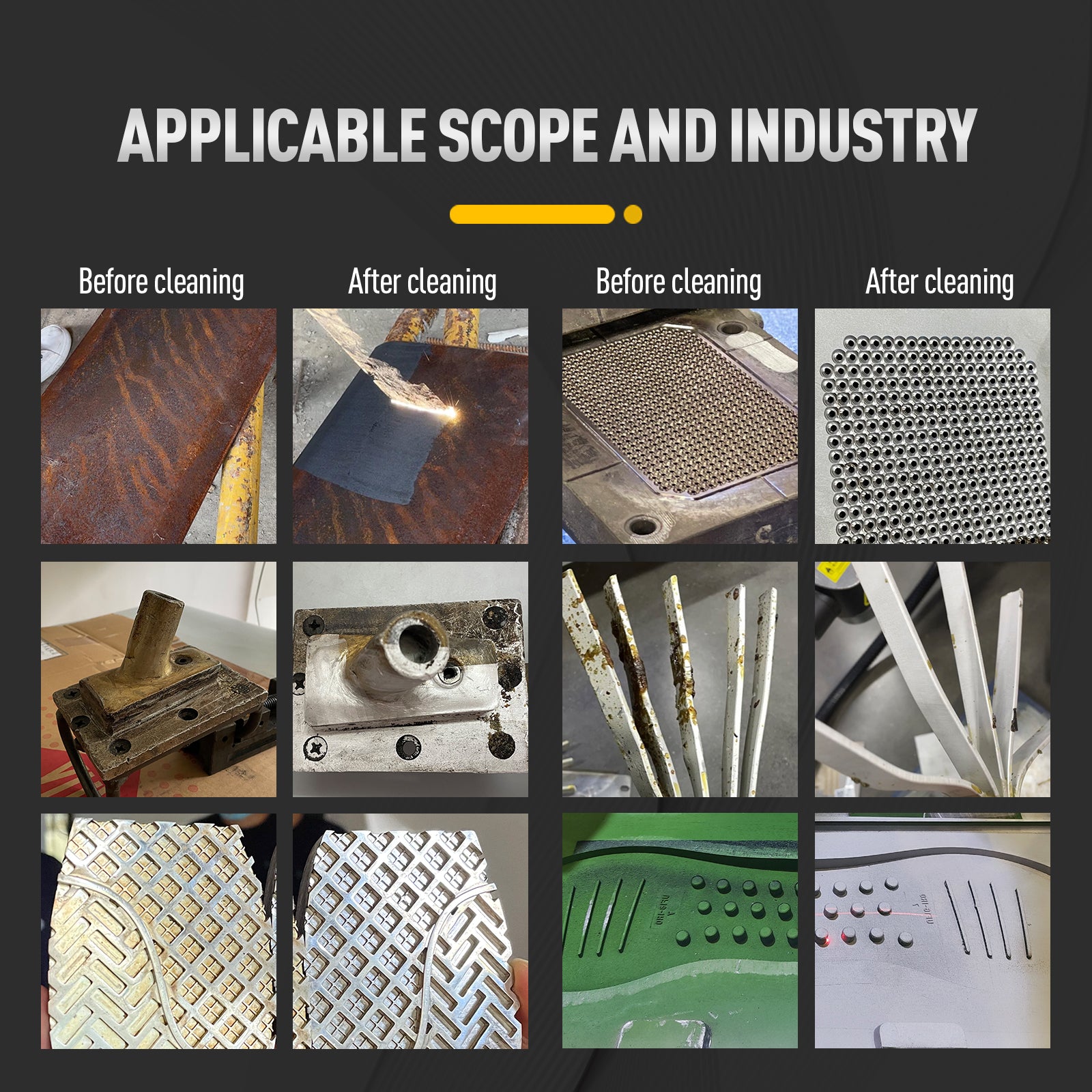 - WIDE APPLICATIONS: This laser cleaner is widely used in aviation and marine, electromechanical, rubber mold, equipment manufacturing, auto parts, and food processing. Common Applications: classic car rust paint repair, steel construction rust removal, graffiti removal, metal parts cleaning, paint stripping and removal, rust and corrosion removal, etc.