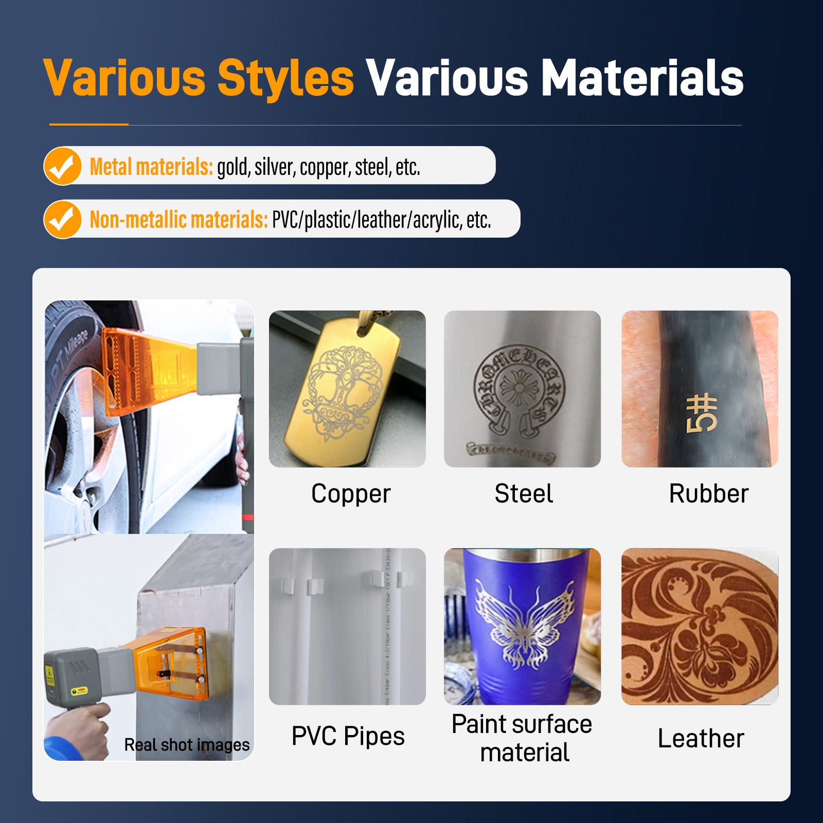 - WIDE APPLICATIONS - The handheld laser marker machine can engrave on a wide range of materials, including both metals and non-metals such as gold, silver, copper, steel, paper, plastic, glass, leather, and more. Additionally, this fiber etching machine is widely used for personalized customization tasks such as trademark coding and barcode marking, meeting various marking needs.